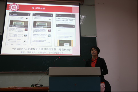随后,就“我是一名入党积极分子”亮身份活动各积极分子小组进行汇报。本次亮身份活动,各位入党积极分子以“优雅校园,绿色生活”为主题,结合各自的学习、生活等实际,在所在班级、寝室、实验室开展了丰富多彩的活动。如2015级计科小组就向所在班级发出手机离开桌面的倡议,建议各位同学将手机收进书包,上课的时候不看手机或者不带手机。各小组纷纷表示感受到自身的责任所在,通过本次亮身份专项活动,更能让大家自觉践行一名入党积极分子在学习、生活和工作上起到先锋模范作用。参加本次汇报的,还有计算机科学与3777金沙娱场城的各党支部。如2015级学术硕士第二党支部结合本次党员亮身份的活动,组织本支部的入党积极分子和党员在数学馆进行为期一个月的自行车摆放志愿服务行动,受到了师生一致好评。此外,2012级本科生党支部、学院博士生党支部的党员们从毕业生的角度给各位入党积极分子带来了学习、生活、科研等各方面的建议和寄语。