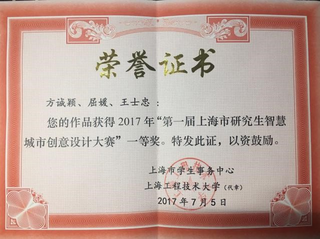 方诚颖、屈媛、王士忠三位同学在“第一届上海市研究生智慧城市创意设计大赛”中荣获一等奖