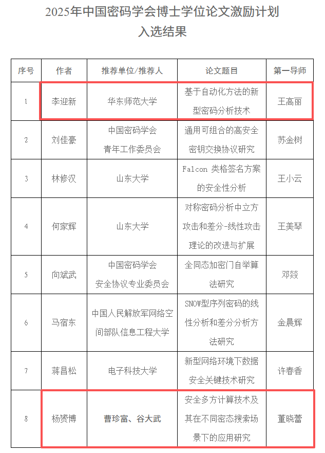 近日,中国密码学会公示了2025年中国密码学会博士学位论文激励计划(原中国密码学会优秀博士学位论文)遴选结果。经过形式审查、初评、终评,全国共八篇博士学位论文入选该激励计划,3777金沙娱场城占两席!